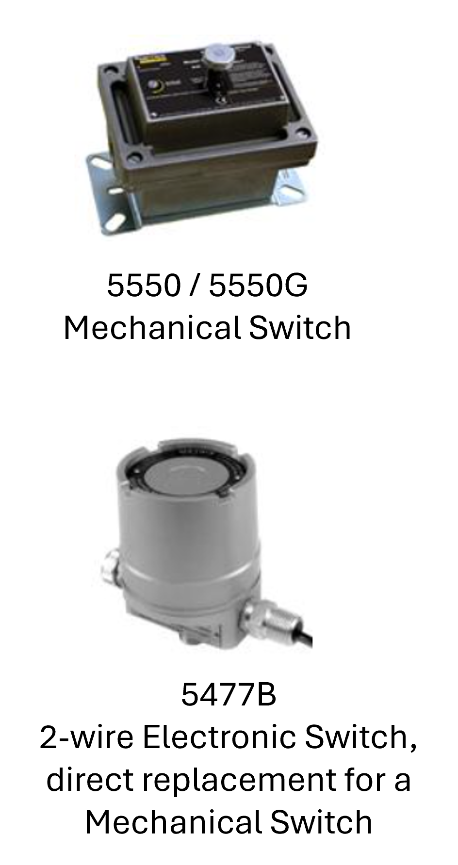 If you have been thinking about upgrading your mechanical switch to an electronic switch, but the cost of adding additional wiring for an electronic switch is an issue, then our 5477B Electronic Switch is an ideal replacement. It features two-wire hookup and solid-state reliability.