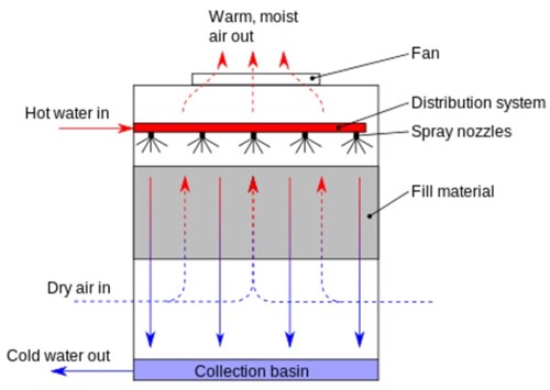 In the dry cooling tower there is no evaporation in the process. The hot working fluid flows inside the tube bundles. The tube bundles have a very large convection surface area. The lower temperature ambient air flow is blown from outside tube bundles. As a result, the hot fluid is cooled. The diagram is shown below.