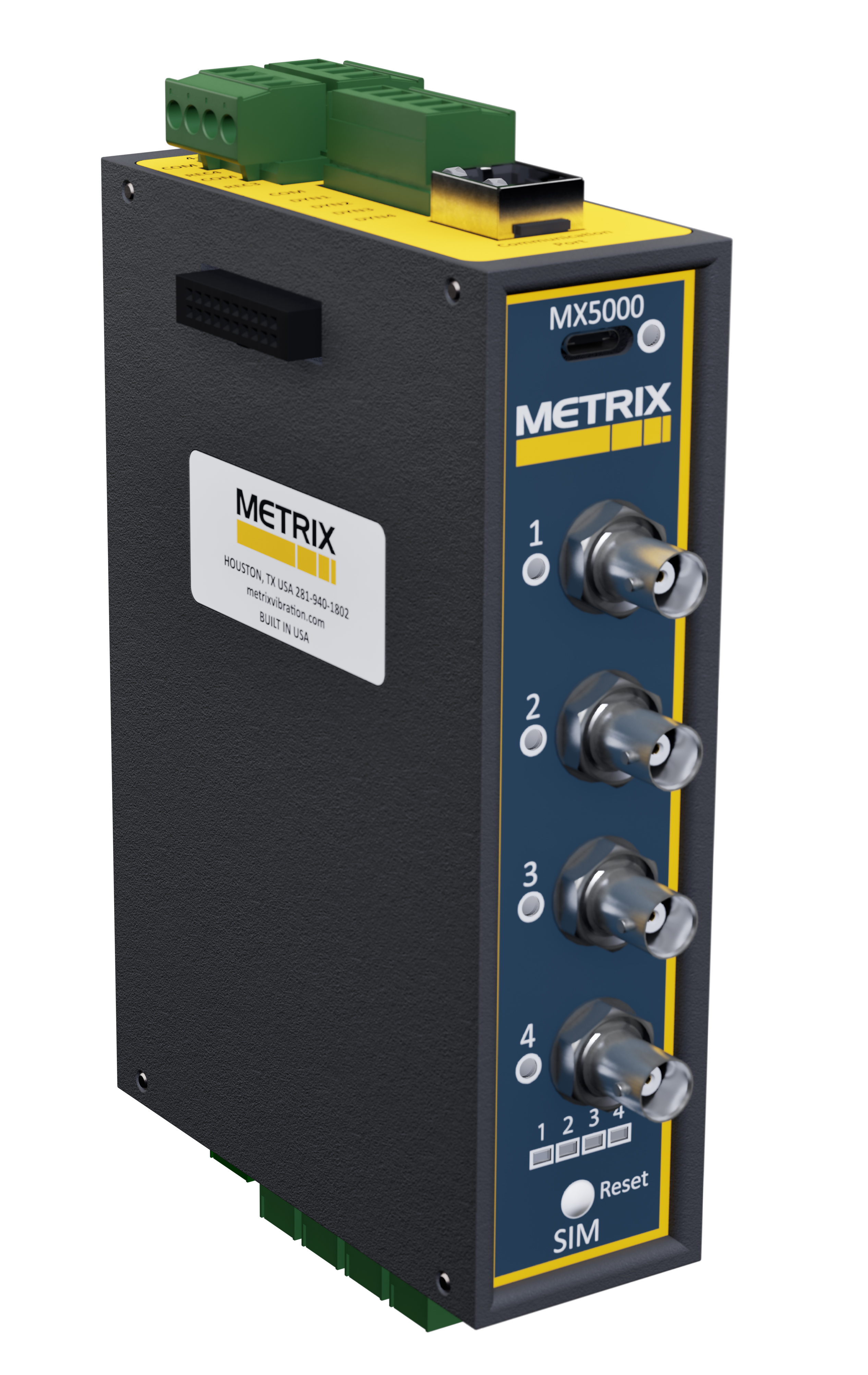 It also has the ability to stack MX5000-SIM modules to add additional channels, up to 6 modules or 24 channels. For each channel, a green LED indicates sensor and cable integrity. In the event of sensor failure, the LED changes to red and the output current is driven below 3.6 mA, thereby signaling a malfunction. The alarm status of each channel is indicated by the LED flashing yellow for Alert and flashing red for Danger. A BNC connector gives access to the dynamic input signal prior to any processing for local analysis. Isolation is provided between input, outputs and supply. In the MX5000-SIM, there are four Solid-State relays which can be configured with AND/OR logic from any channel’s Alert or Danger status. There is a dedicated LED for each relay to indicate status. The alarm levels and relays can be configured using the free Metrix MX5000 software downloaded from the website.